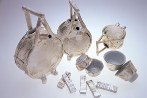 助けあい、時には罵りあったりしながらも、お互いの才能を認めあい、それぞれの個性を大切にした、仲良し夫婦です。鐵男さんは金沢美術工芸大学で工業デザインを学んだ後、石川県工業試験場で働いていましたが「図面や文書の仕事は性にあわん」と奮起して、独学でやきものの道に。名古屋でやきものを勉強していた時に、利子さんと知り合って今日まで32年です。鐵男さんが駆け出しの頃は、利子さんは友禅の彩色で家計を助け、忙しくなってきたら家業を手伝い、わがままな旦那さんとつつましい奥さんの見本のようなお二人です。いつもは、赤絵や染付がお得意の鐵男さんですが、今回は「加賀は銀箔だ。ゆっくり飲もうよ」と、加賀の殿様のように粋で、酒樽のように勢いのある造形の器です。 | ![]() |