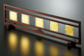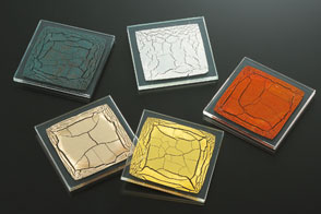 「箔硝子」は、1万分の1ミリといわれる極薄の箔を、板状の強化ガラスにはさんで加工したものだ。透過光とともに見る箔は角度や照度によって表情が微妙に異なり、多面的な魅力を映し出す。用いた箔は金箔と、硫黄で燻して微妙な色合いに仕上げた銀箔。銀のように空気にふれると色が変化する金属も、この加工を施すことでずっと同じ色が楽しめるという。今回はまず、コースターと結界の提案となった。今後どのようなシーンで展開されるのだろうか。活躍が待たれている。 |